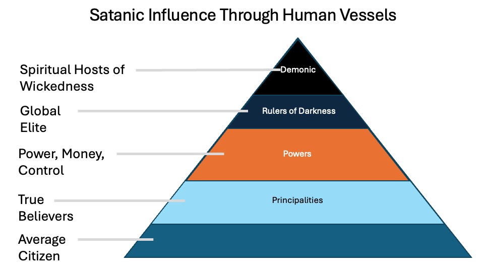 - Describes the hierarchy of Satan’s influence: average citizens, true believers, power money and control, global elites, and the demonic realm.