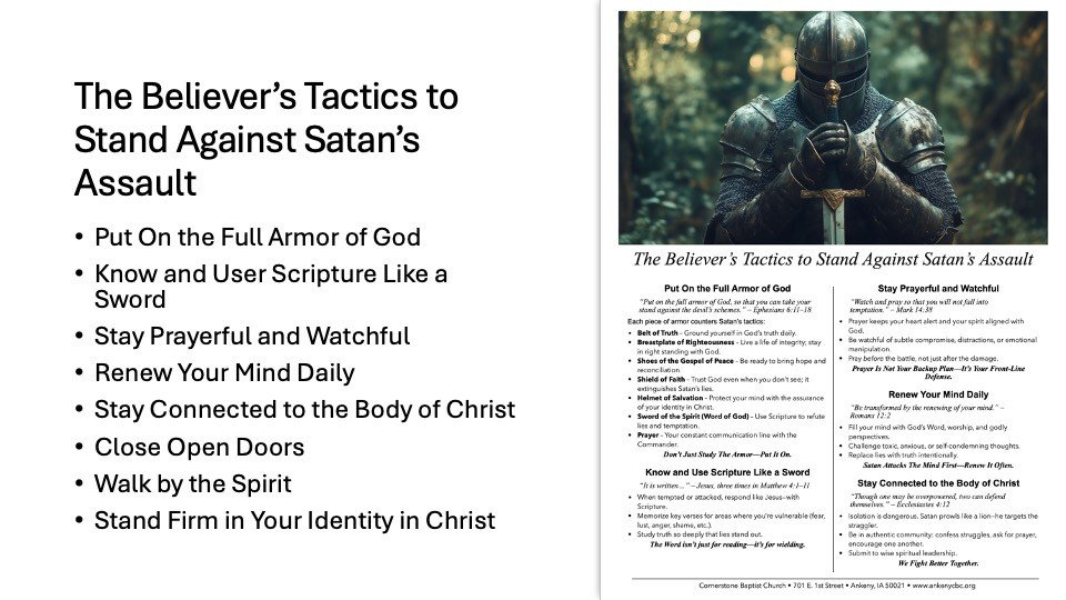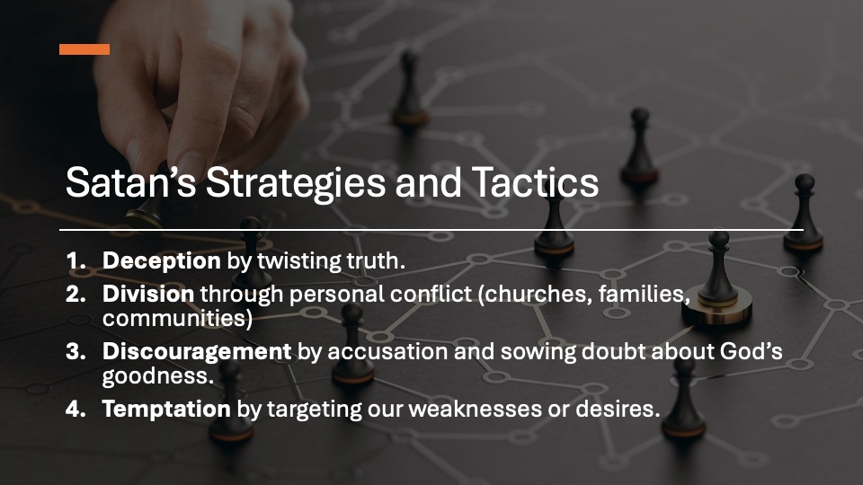 - Lists Satan’s strategies: deception, division, discouragement, and temptation.