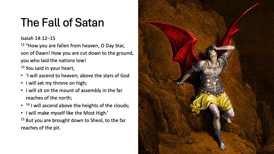 - Describes Satan’s fall from grace, his sin of wanting to be like God, and his desire for worship.