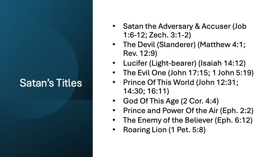 - Lists various titles for Satan, including adversary, devil, and prince of the world.