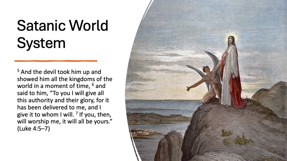 - Describes Satan’s domain as the world, supported by Luke 4:5-7, where Jesus is tempted by Satan.